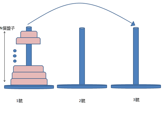 柱子1號已經排好盤子由大到小,接著把所有盤子一道3號柱子